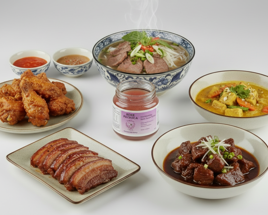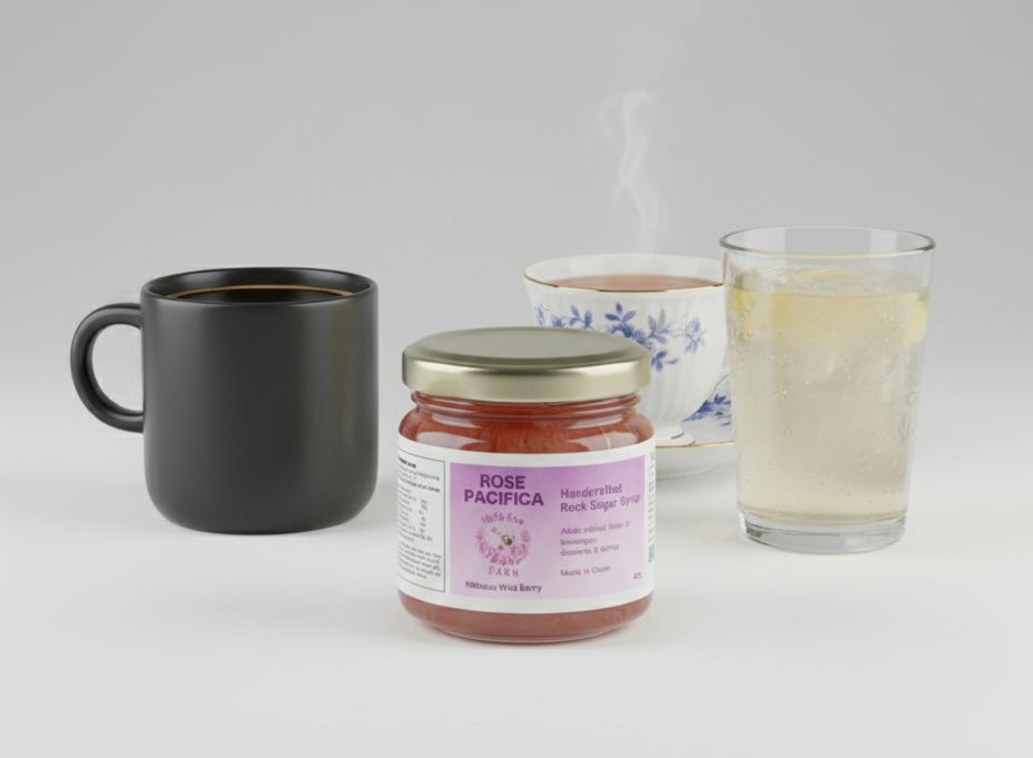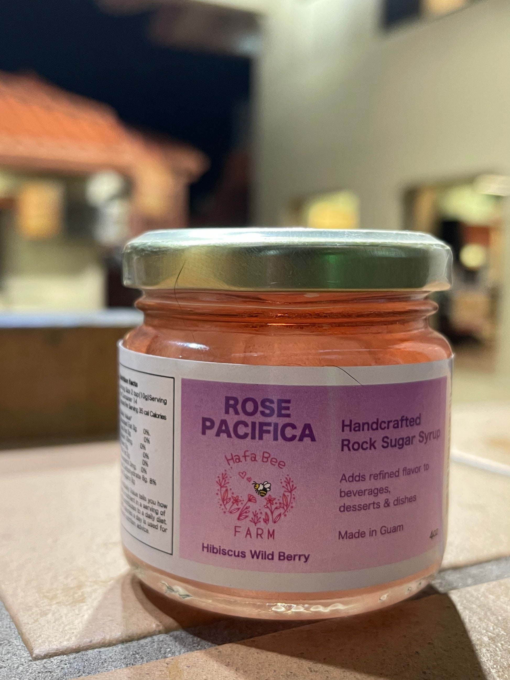Rose Pacifica is a premium rock sugar syrup infused with vibrant hibiscus and wild berry flavors, handcrafted in Guam to elevate both sweet and savory creations.